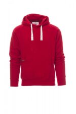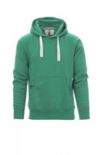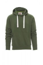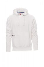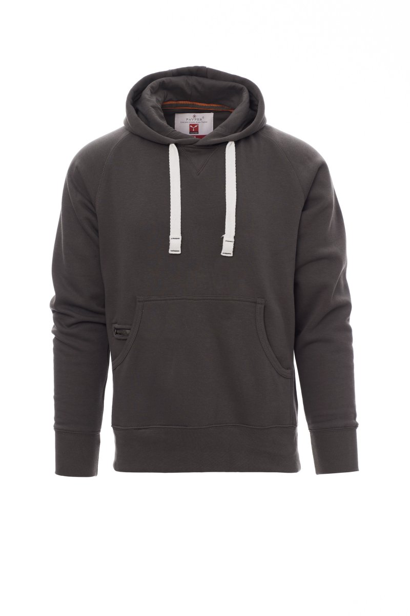 Sweat-shirt homme avec capuche à deux coutures et coulisse en cordon blanc à coutures teinte assortie et anneaux en métal . Manches raglan, couture esthétique en V au col, poches kangourou, petite poche zippée, poignets et taille en côtes élastiques, coutures renforcées.