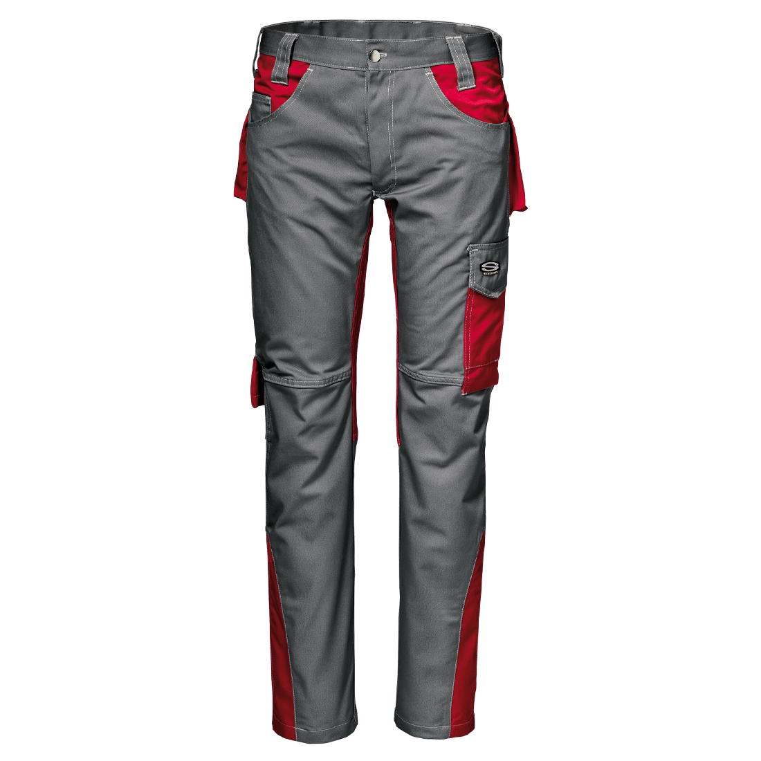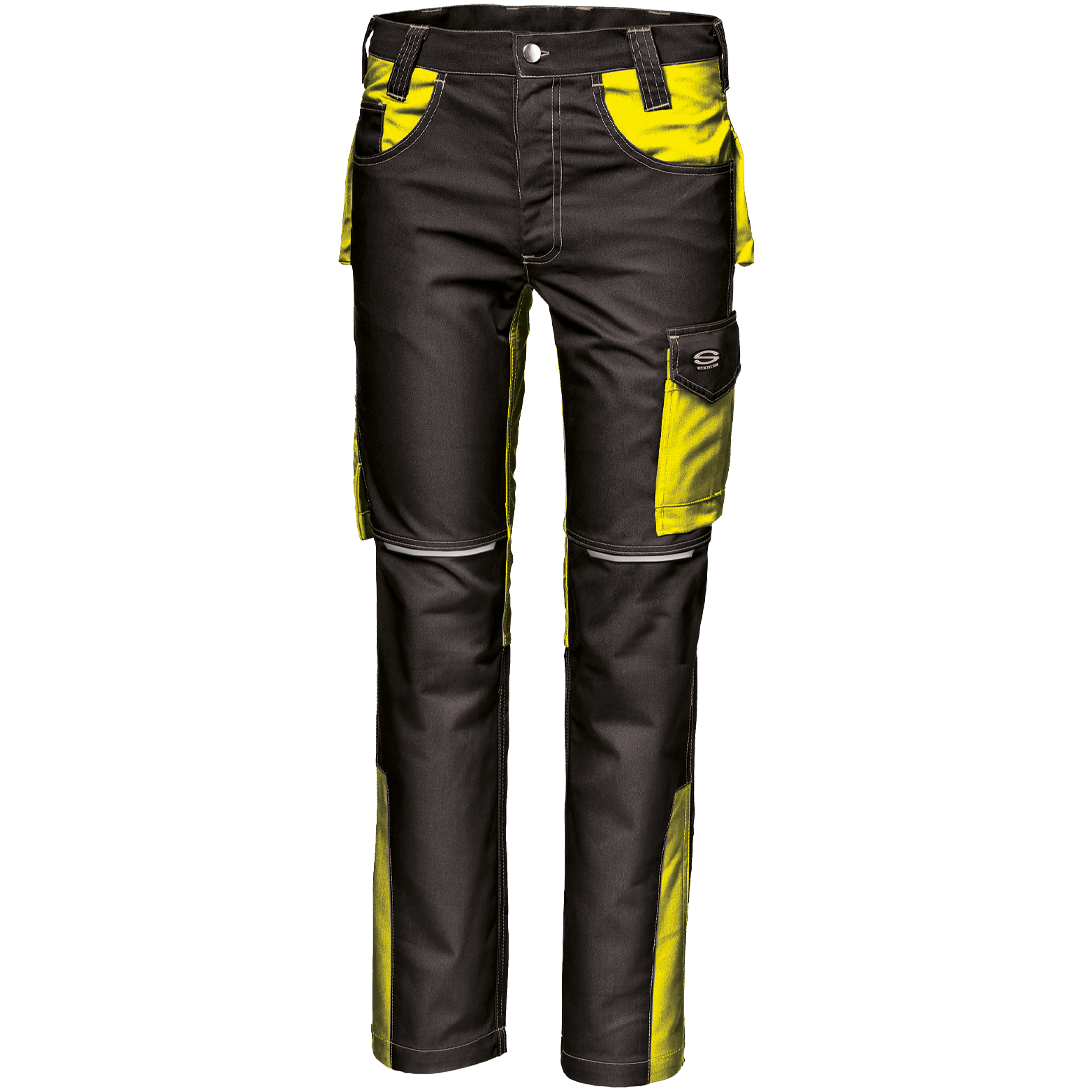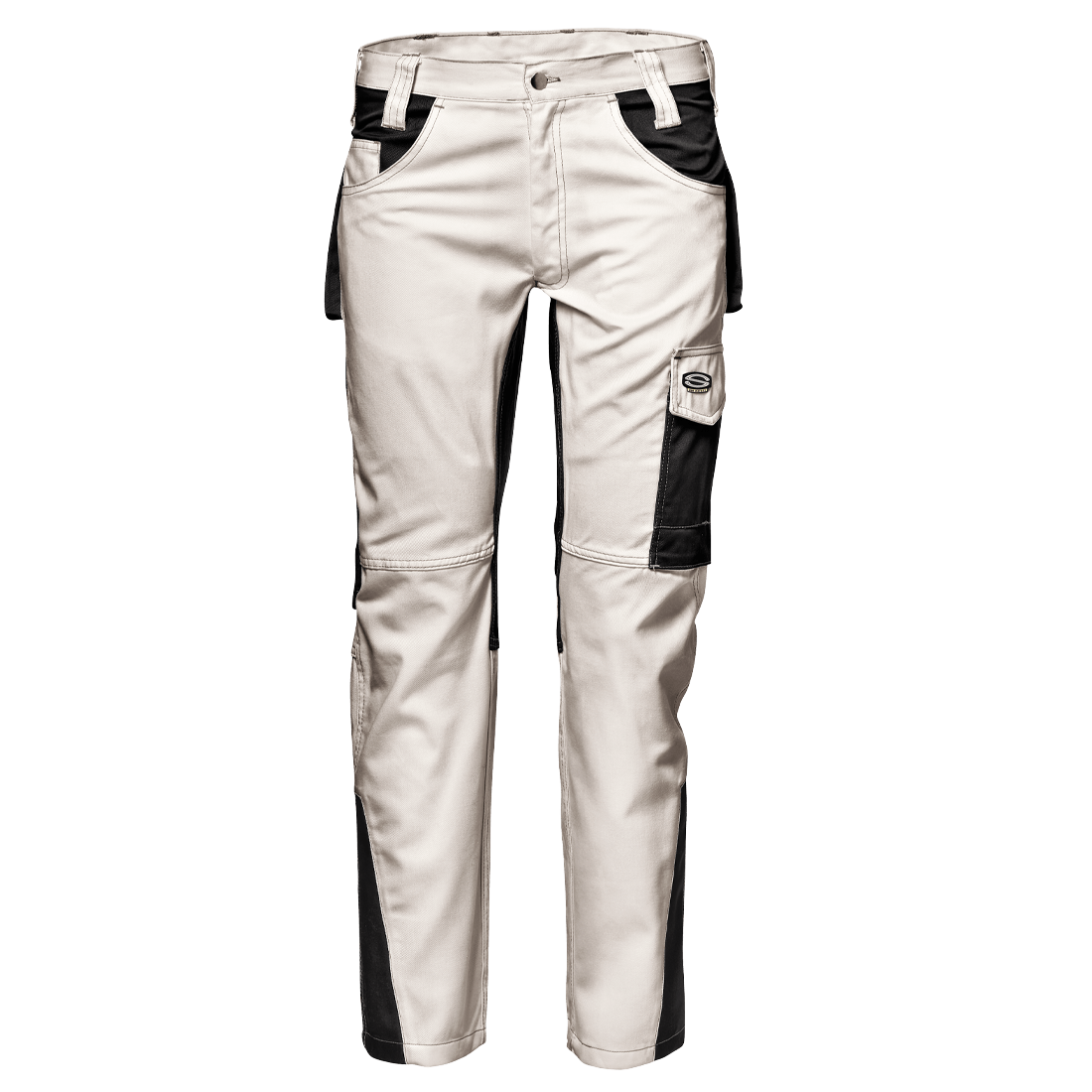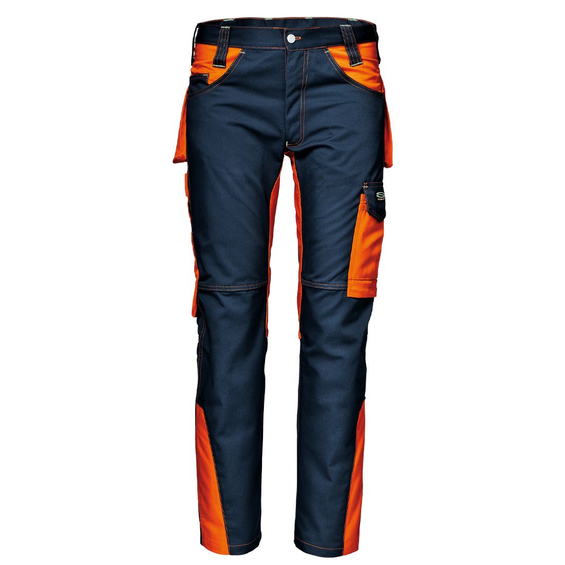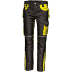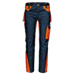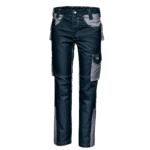 Braguette avec fermeture éclair et bouton d’accrochage, deux poches avant et poche à monnaie à droite, poche mètre avec porte-outils à droite, poche arrière droite avec rabat et velcro, poche arrière gauche avec fermeture velcro, poche utilitaire multifonctionnelle avec rabat et velcro, avec porte-stylo et poche pour téléphone, points d’arrêt de renfort de couleur contrastée.
