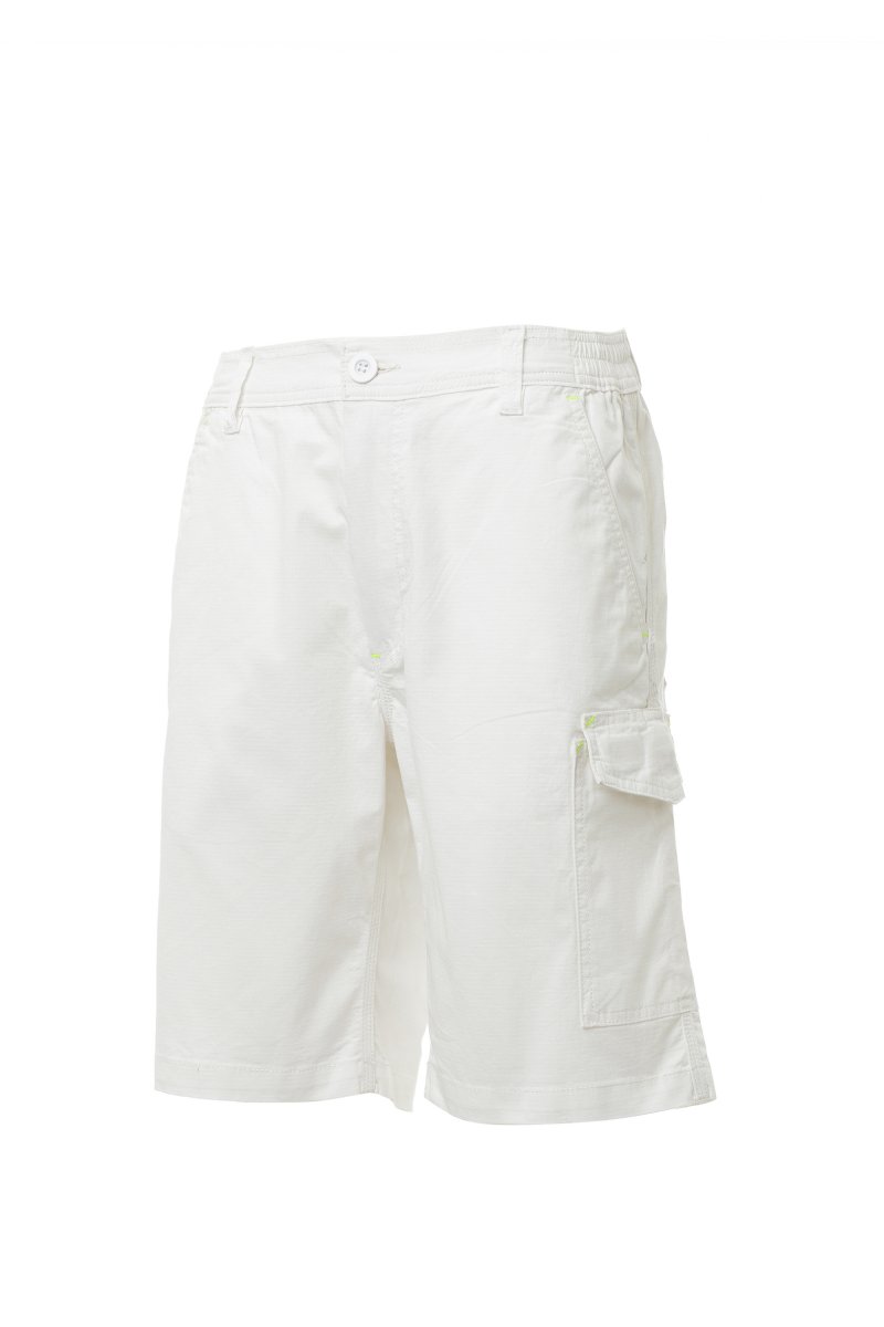 Bermuda réalisé en tissu Ripstop Stretch, léger, avec passants et élastique à la taille, fermeture à rabat avec zip et bouton en ceinture. Poches de coupe classique sur le devant, avec petite poche porte-monnaie dans la poche droite du vêtement porté et un porte-mètre latéral. Poche latérale gauche avec rabat de fermeture LOCK SYSTEM. Deux poches arrière, dont une avec rabat et velcro. Coutures triple piqûre.